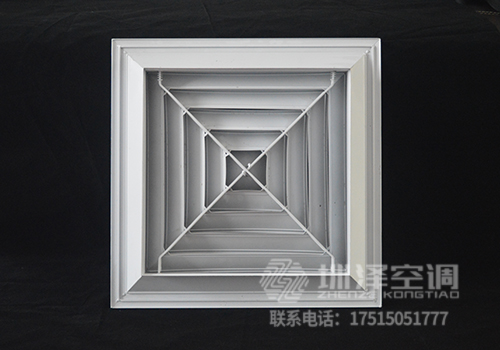 方形散流器先調(diào)挺直,表面光潔,葉片角度為固定式,葉片采用夾角片沖壓連接,整個(gè)葉片與邊框采用分離式結(jié)構(gòu),以方便安裝與調(diào)節(jié)。設(shè)計(jì)時(shí)可根據(jù)房間造型不同,選用不同出風(fēng)方向的散流器,可與調(diào)節(jié)閥配套使用。方形散流器有四種氣流吹出形式,分別為一面吹(A1SO)、二面吹(A2SO)、三面吹(A3SO)、四面吹(A4SO)。鋁合金表面經(jīng)陽(yáng)極氧化處理,也可根據(jù)用戶要求進(jìn)行靜電噴塑處理。